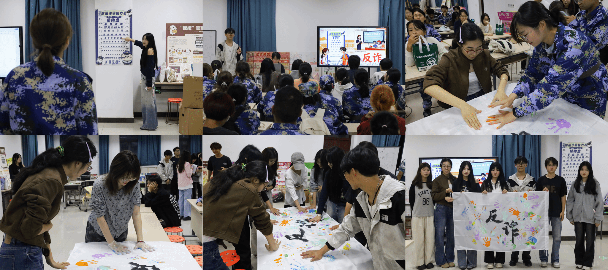 教室另一侧的桌子上,员工们陆续将手掌涂上不同颜色的颜料,在旗帜上按下庄重的手印。设计学类专业2025(1)班的沈乡红分享,作为美术生,对颜料有着天然的喜欢,用喜欢的颜色染满手掌,再按下承诺的手印,让她觉得格外有意义“:”“我感觉真正地参与了活动中,也真正学到了防电诈的技巧。”每一抹色彩都代表一份反诈承诺,每一次按压都是一次责任宣誓。这幅由集体创作的艺术作品,凝聚了校园反诈的共同意志。