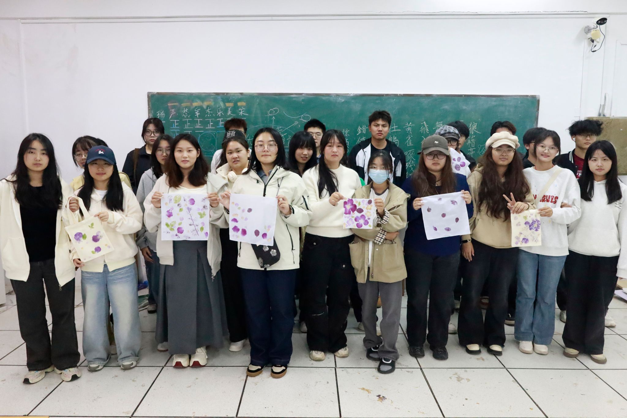 “锤的时候胳膊酸得不行,但掀开胶布的那一刻,所有疲惫都烟消云散了!”设计学专业2025(2)班的翟俊文高高举起自己的作品,帆布包上红玫瑰的轮廓鲜活灵动,红花檵木的紫褐纹路与翠绿蔷薇叶相映成趣。作为第一次接触植物拓染的新手,她难掩兴奋地说到:“亲手创作的成就感太强烈了,原来大自然馈赠的花花草草,能通过这样的手艺变成专属艺术品。”一旁的设计学专业2025(3)班的李雨朔则和朋友互相打趣,看着自己作品中略显模糊的蓝星花纹路,对比朋友那幅线条清晰的橙铃铛拓印,她笑着说:“这就是‘手艺人’的差距呀!不过下次我一定能更好地控制力度,留住更美的花痕。”