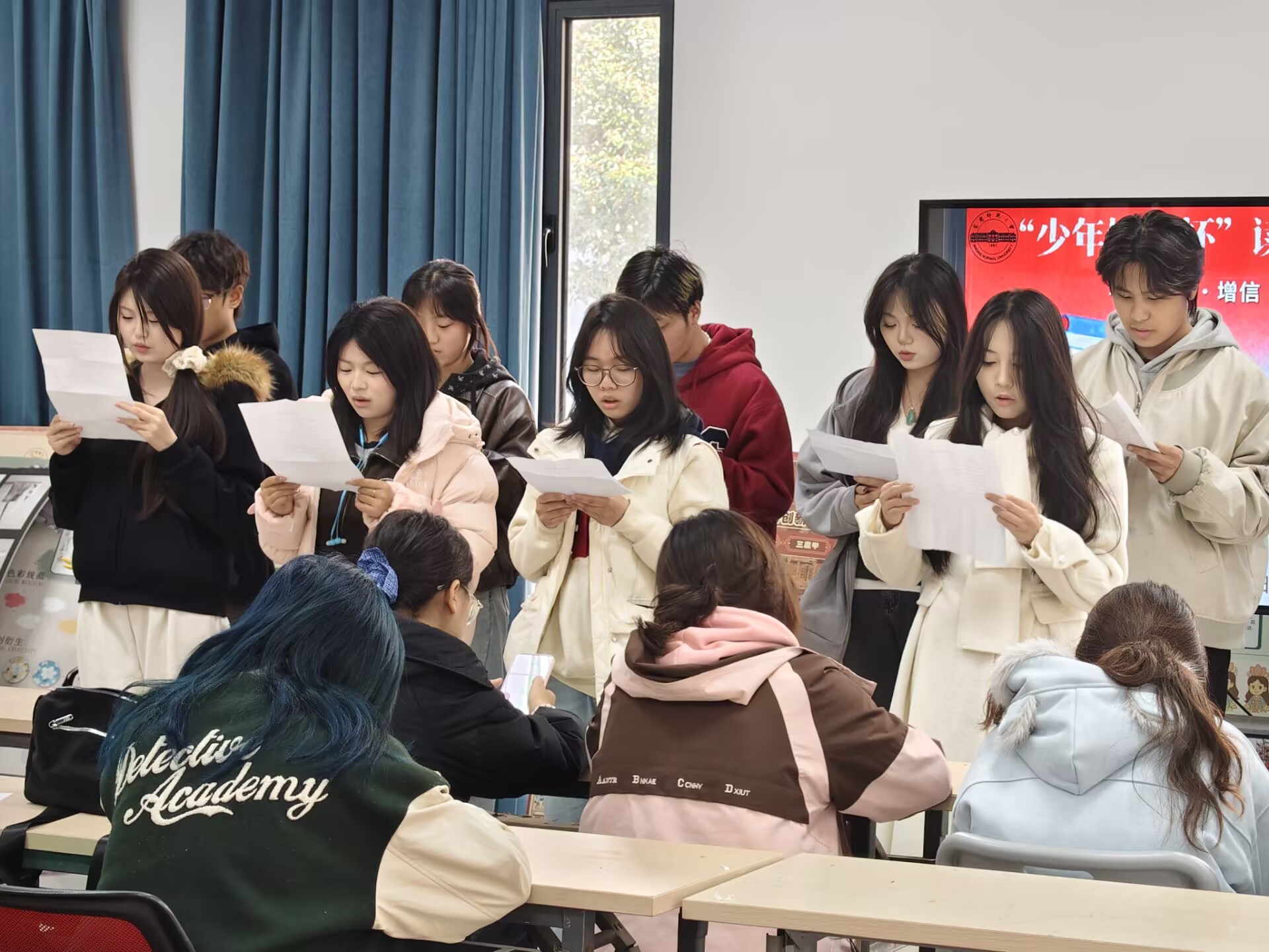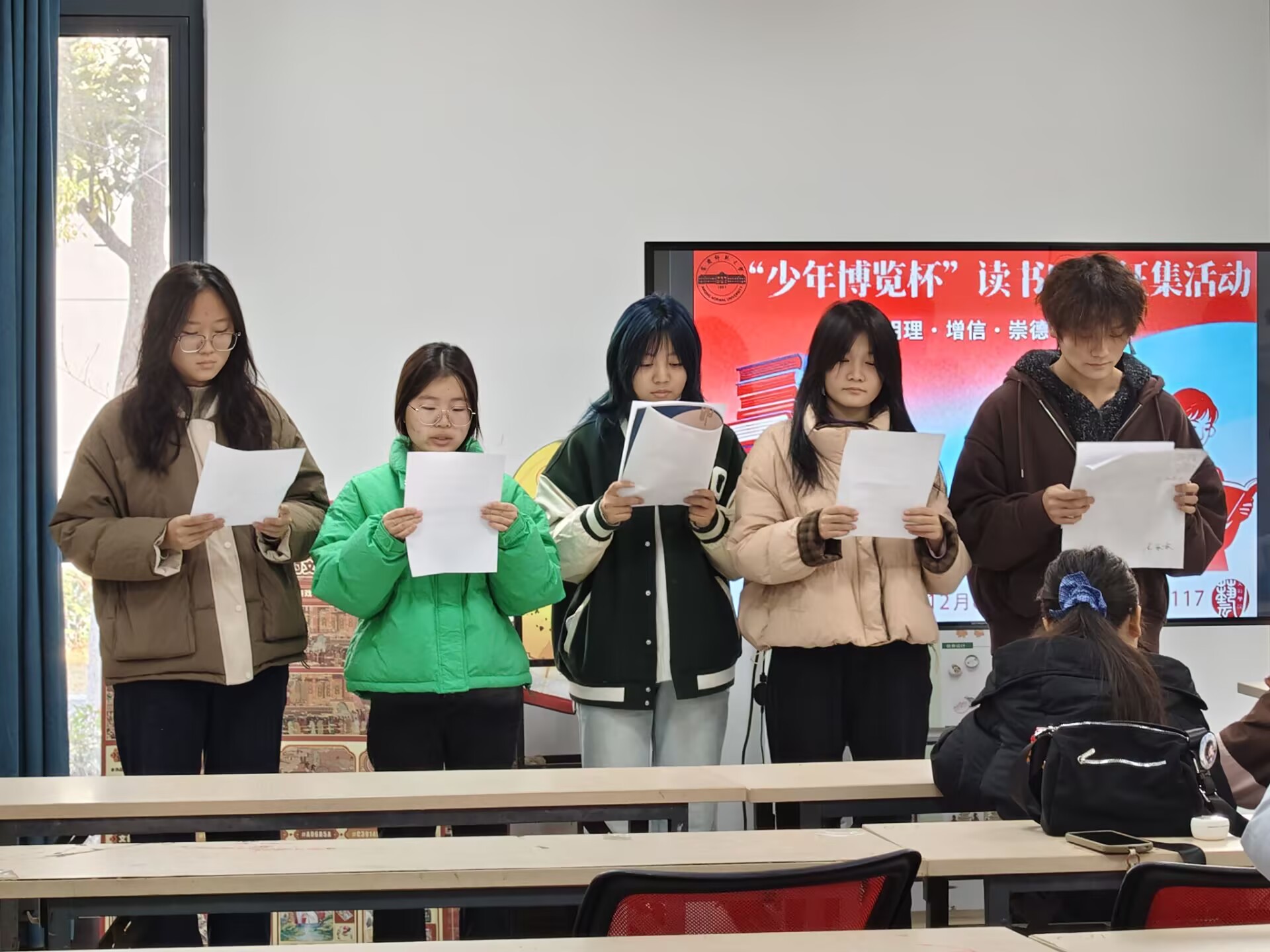 活动现场,入团积极分子带来了集体朗诵,经典篇目在同学们的深情演绎中重现革命岁月,现场还同步展示了大家创作的特色海报与艺术作品,让文字意境与视觉艺术深度融合,对历史的阅读与感悟在作品创作中得到了升华。