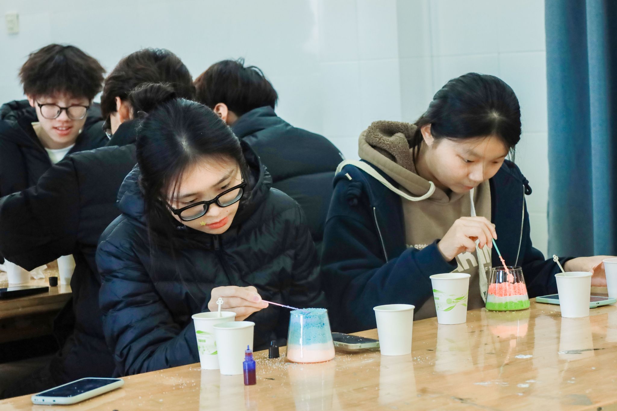 “最近很多地方都下起了初雪,刷着朋友圈里的雪景特别向往。”美术学专业2025(2)班的常静娴手持勺子调整蜡材层次,笑着分享创作灵感。怀着对初雪的期待,她选用蓝色染料调配出深浅各异的蓝蜡,搭配纯白蜡材逐层铺叠,细细勾勒出雪花纹路,简约灵动的造型满是冬日氛围感。作品成型后滴入薰衣草精油,她举起成品笑道:“这是我第一次做沙画香薰,成就感满满!”