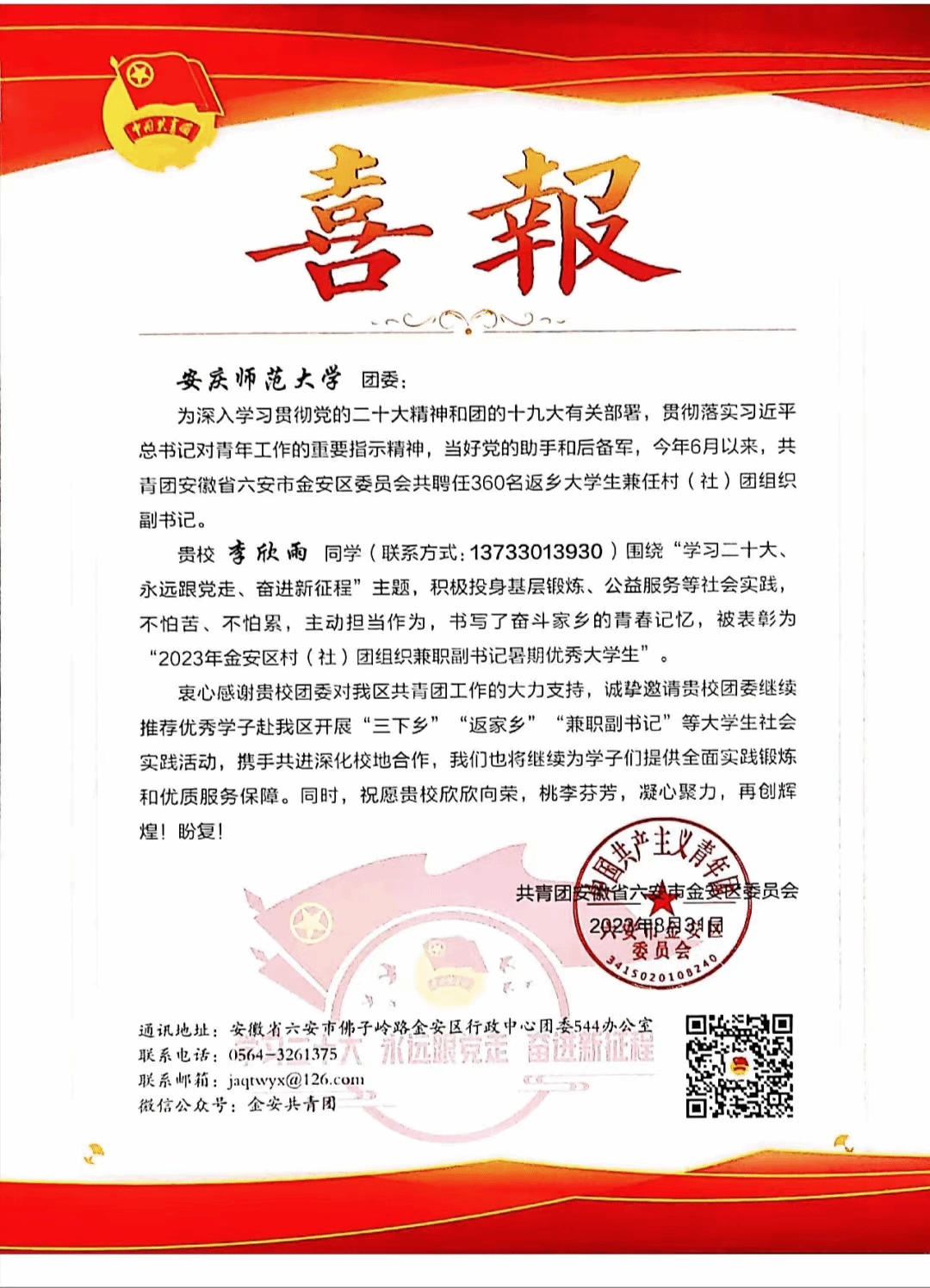 近日,共青团安徽省六安市金安区委员会发来喜报,对公司团委的大力支持表示感谢,对公司美术学专业2022(1)班的李欣雨进行表彰,授予该同学“2023年金安区村(社)团组织兼职副书记暑期优秀老员工”荣誉称号。