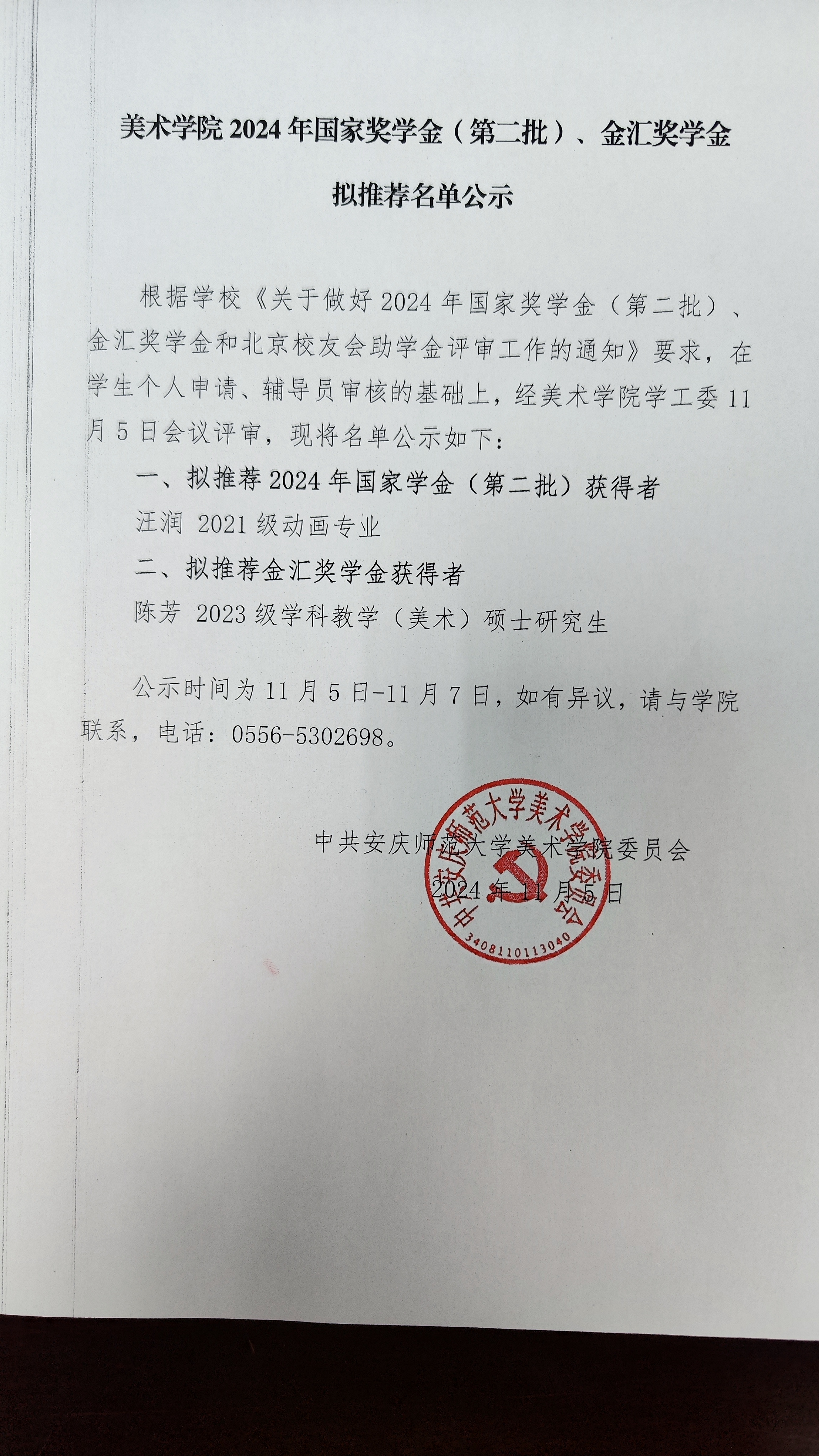 根据公司《关于做好2024年国家奖学金(第二批)、金汇奖学金和北京员工会助学金评审工作的通知》要求,在员工个人申请、辅导员审核的基础上,经tyc122ccVIP学工委11月5日会议评审,现将名单公示如下: