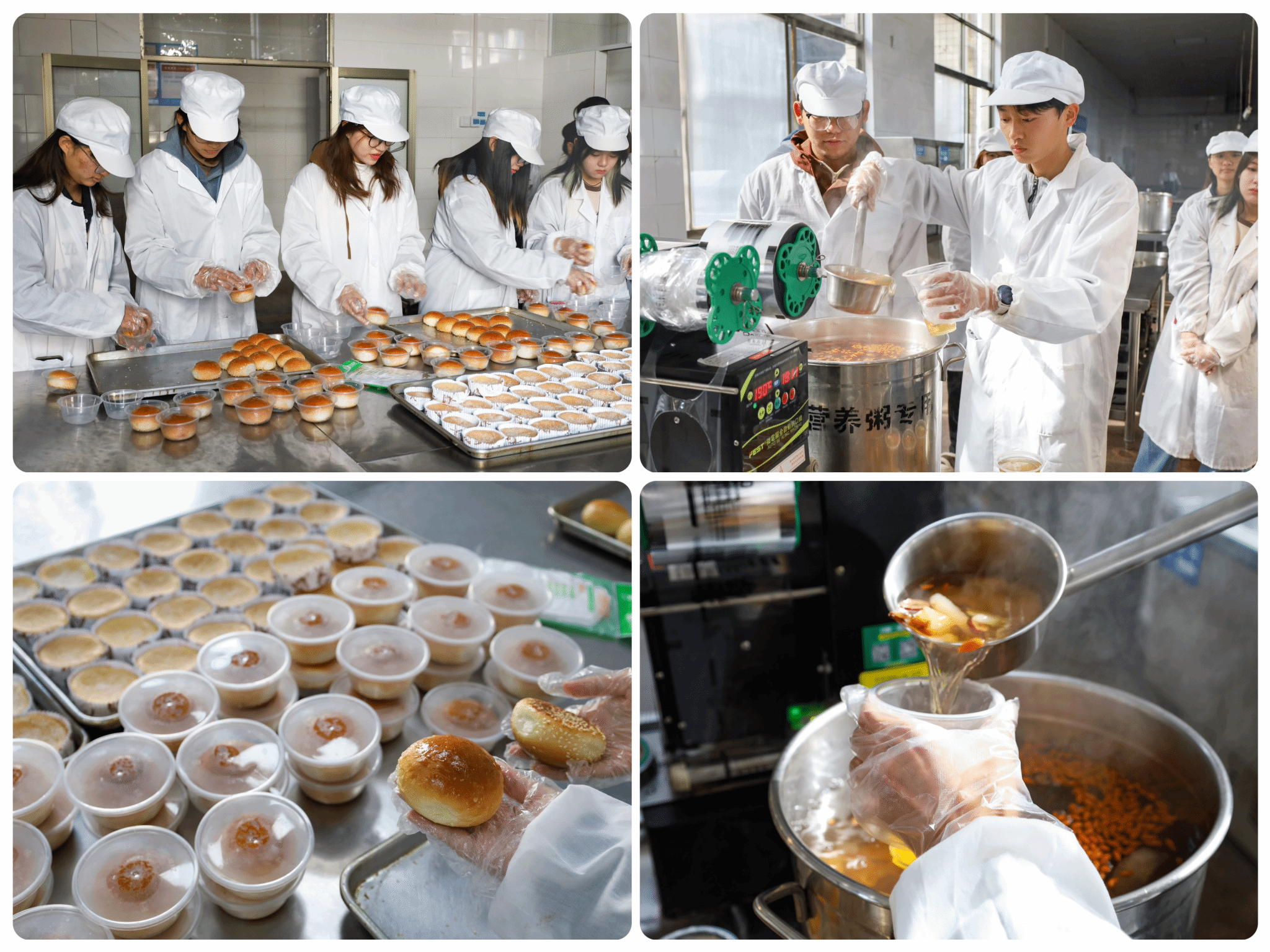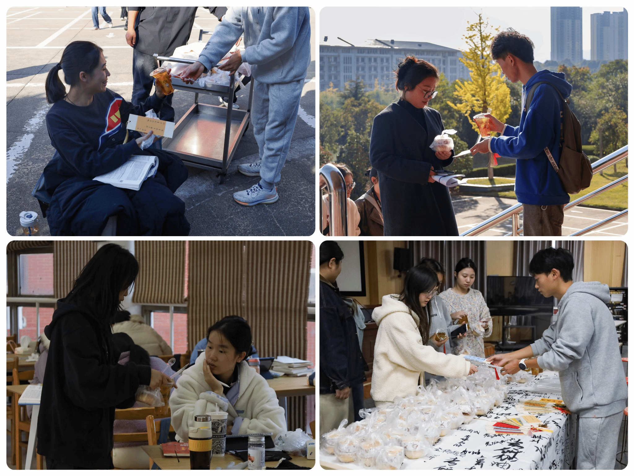 志愿者们到达食堂后厨后,有的掌勺分杯盛放银耳雪梨羹,有的则将刚出烤箱的面包分类装盒、密封包装,最终将它们一并放到小推车内,手携手工礼物,前往图书馆与公司报告厅,为来往的考研学子送去礼包与祝福。“有的学长学姐走路都在看书,希望我们准备的加油礼包可以为他们紧张的生活减去一份压力,带去一份温暖。”设计学类专业2023(3)班的高秀英说。
